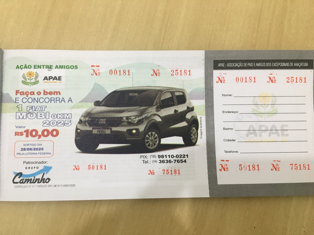 Faça o bem com apenas R$ 10,00 e concorra a um Fiat Mobi 2025 com quatro números!