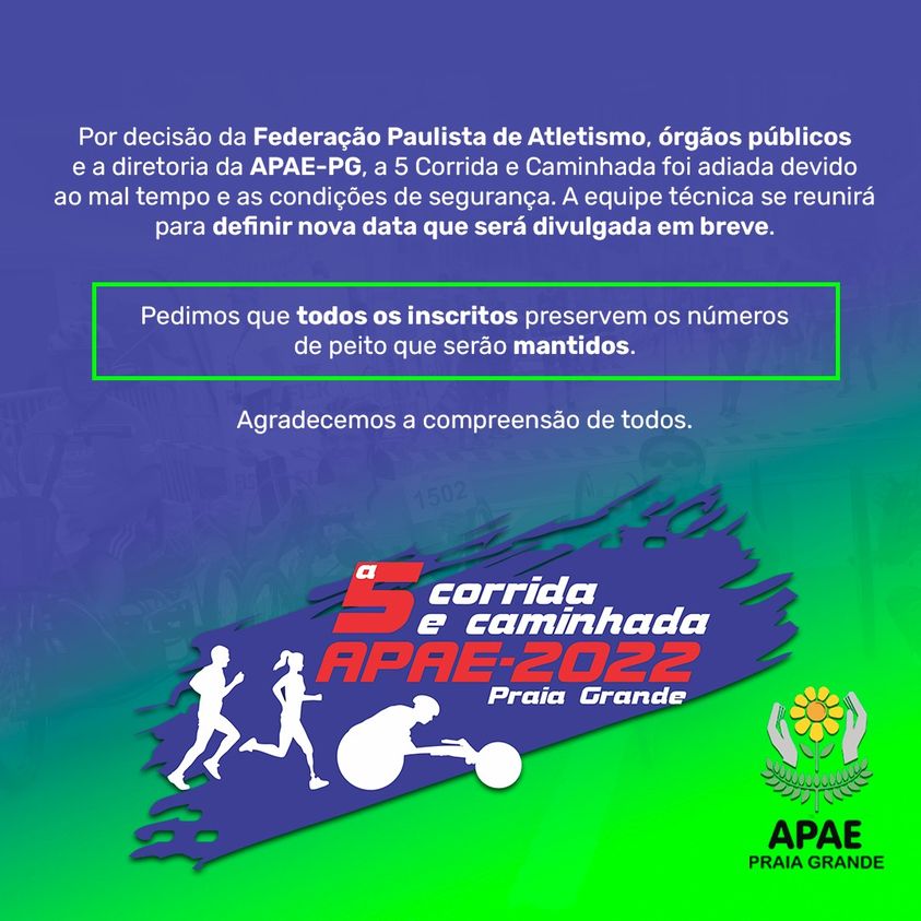 Por decisão da Federação Paulista de Atletismo, órgãos públicos e a diretoria da APAE-PG, a 5 Corrida e Cami... [leia mais]